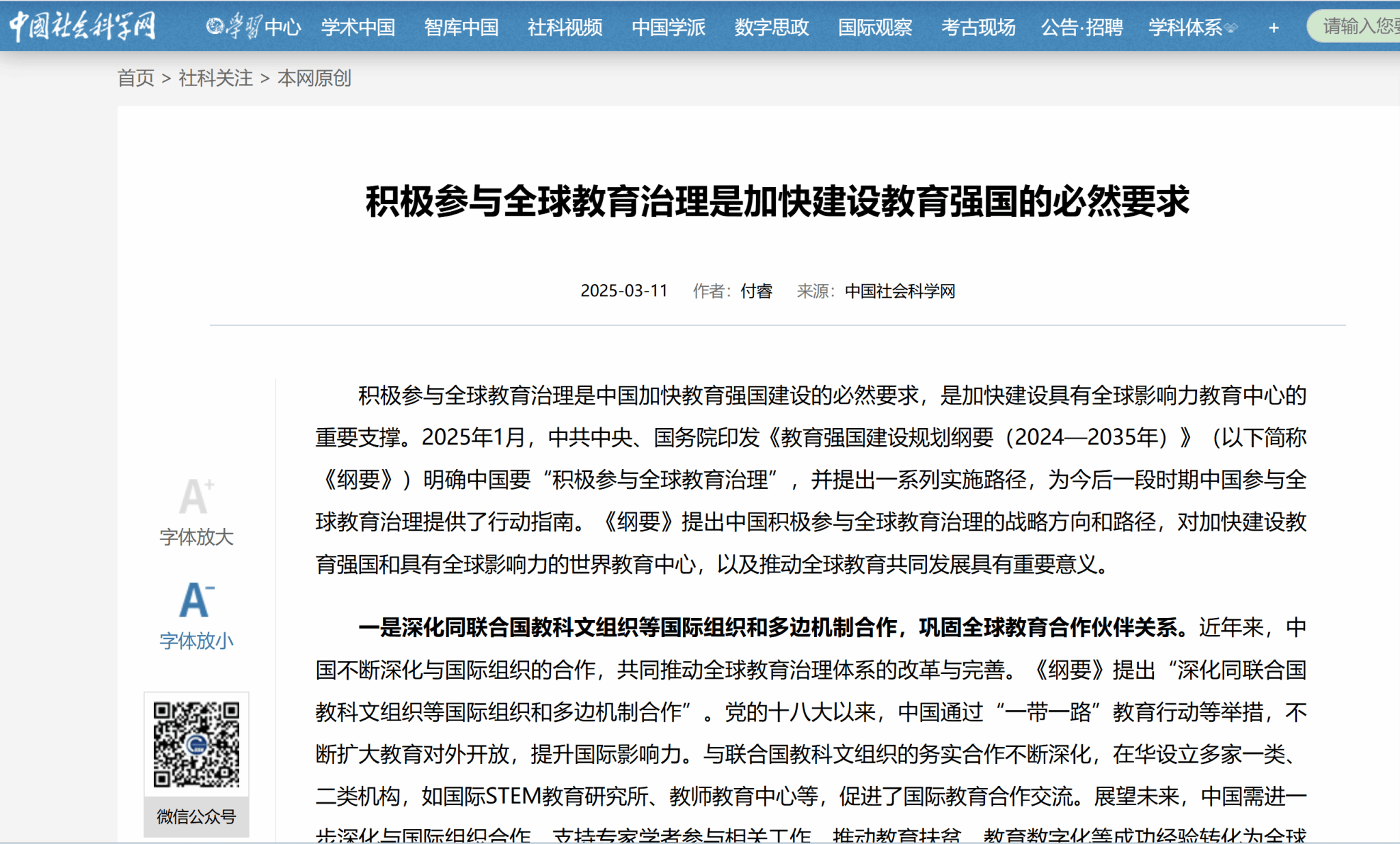 中国社会科学网丨付睿:积极参与全球教育治理是加快建设教育强国的必然要求