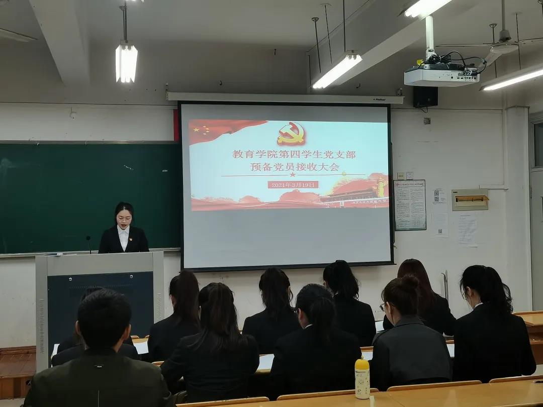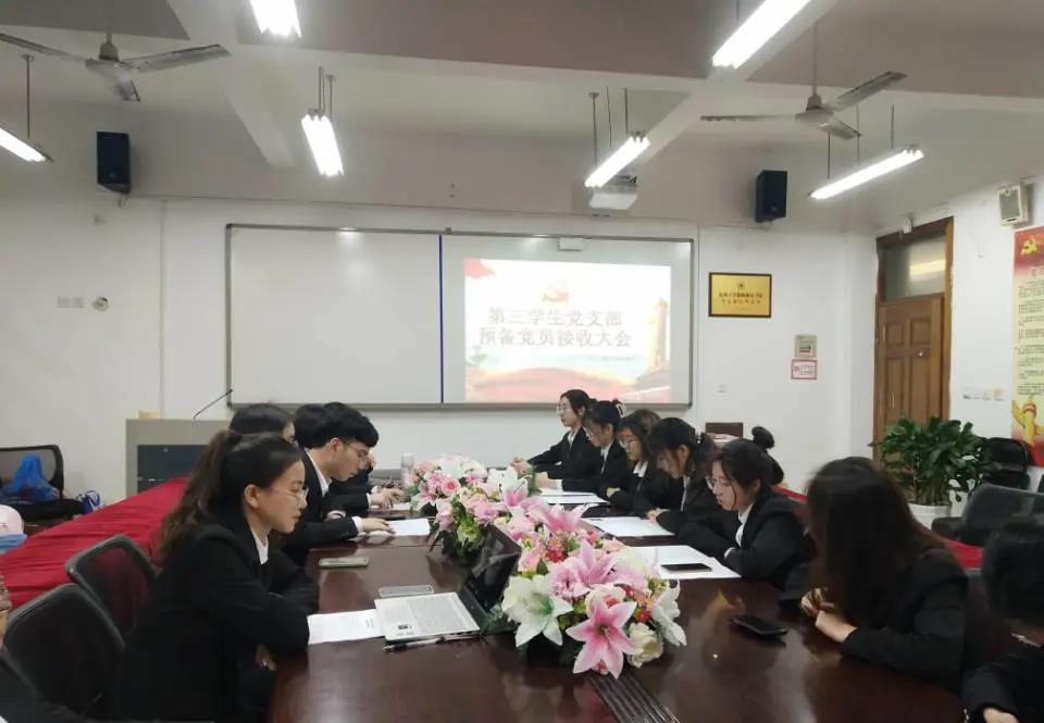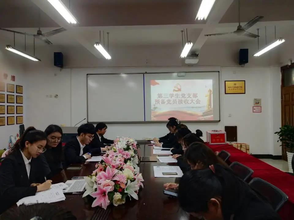 2021年3月19日,第四学生党支部中共预备党员接收大会在williamhillB301举行,会议由党支部书记助理谢红同志主持,该支部全体党员参与此次会议。经党支部大会决议,一致同意接收黄雨霞、应俊鑫、周佳佳、方东欣、周绮阳、项静、徐诗琦、陈银燕、姜文静、吴晓晓、陈慧彬、蔡政倩12名同志成为中共预备党员。