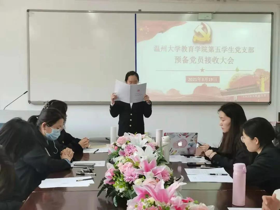 2021年3月19日,第五学生党支部中共预备党员接收大会在williamhill党员之家举行,会议由周晨霏同志主持,该支部全体党员参与此次会议。经党支部大会决议,一致同意接收汤美萍、王亭亭、曹嘉芮、李柠、蔡婷美5名同志成为中共预备党员。