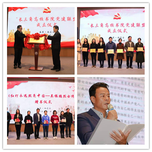 随后进行的是“长三角高校书院党建联盟”揭牌及赠书仪式。该仪式旨在打造红色书院、传承红色基因。活动由南京审计大学党委副书记张建红、雨花台烈士陵园管理局党委书记兼局长赵永艳为“长三角高校书院联盟”进行揭牌,并向各成员单位授牌。著名作家曹峰俊先生向包括我校在内的十所书院联盟单位赠送《红灯永远照亮中国——吴振鹏烈士传》书籍,并分享了创作体会。吴振鹏烈士外孙、著名演员黄品沅先生朗诵了吴振鹏烈士的绝笔信和革命檄文。
