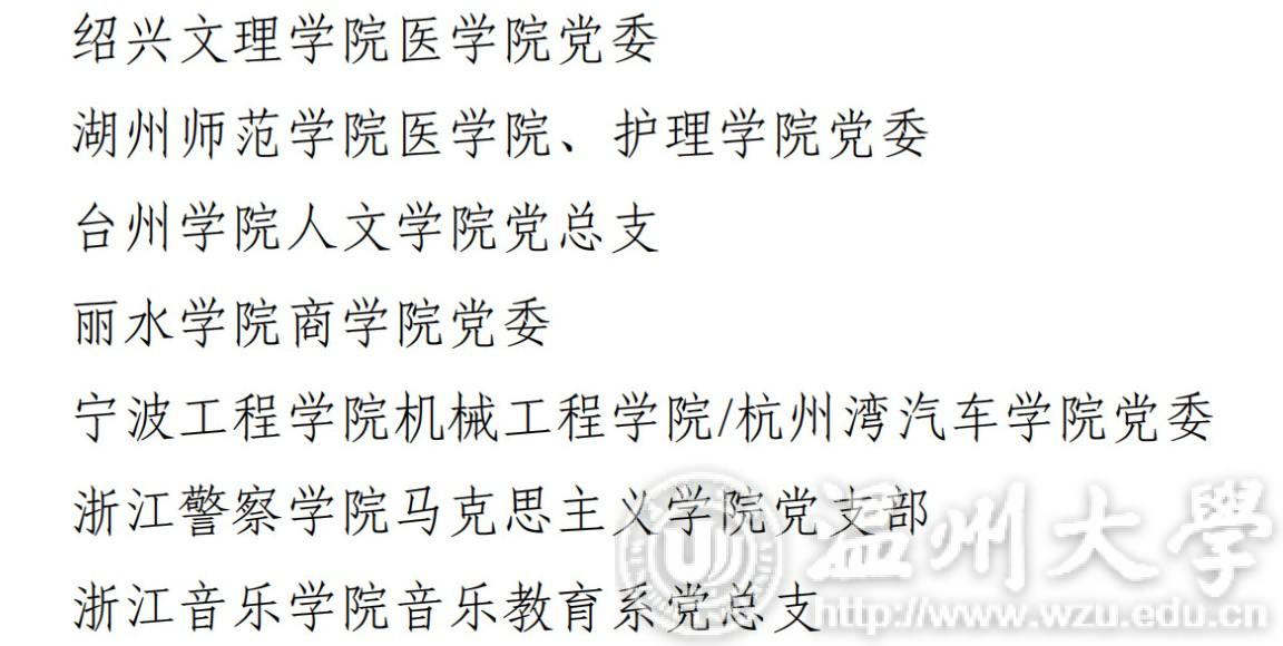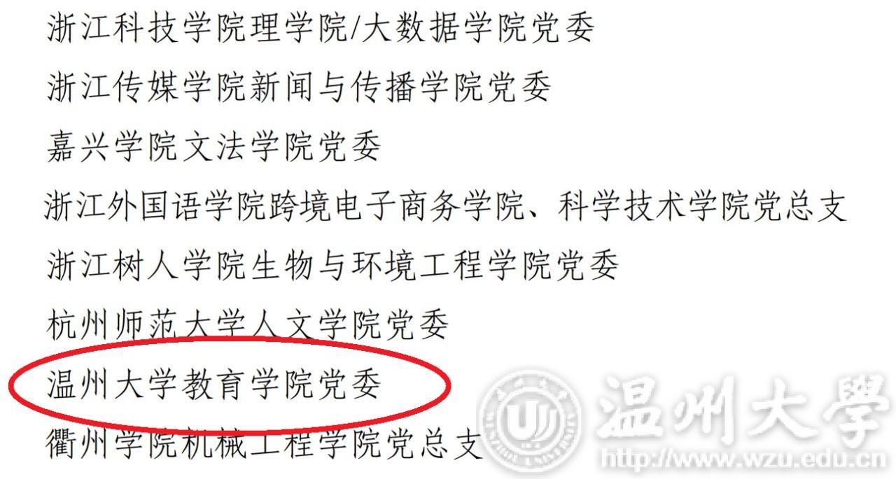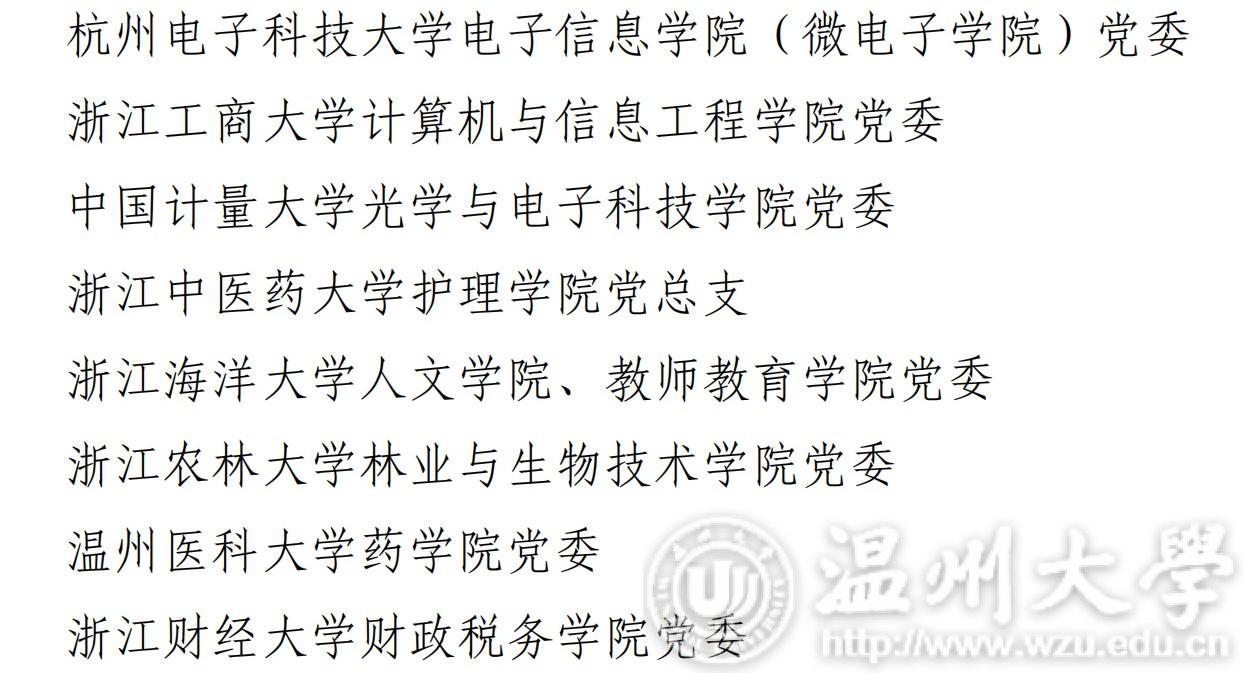 近日,中共浙江省教育厅委员会办公室关于公布首批全省高校党建工作示范高校、标杆院系、 样板支部培育创建单位名单,William威廉williamhill党委在众多高校中脱颖而出成为52个“标杆院系”培育创建单位之一。