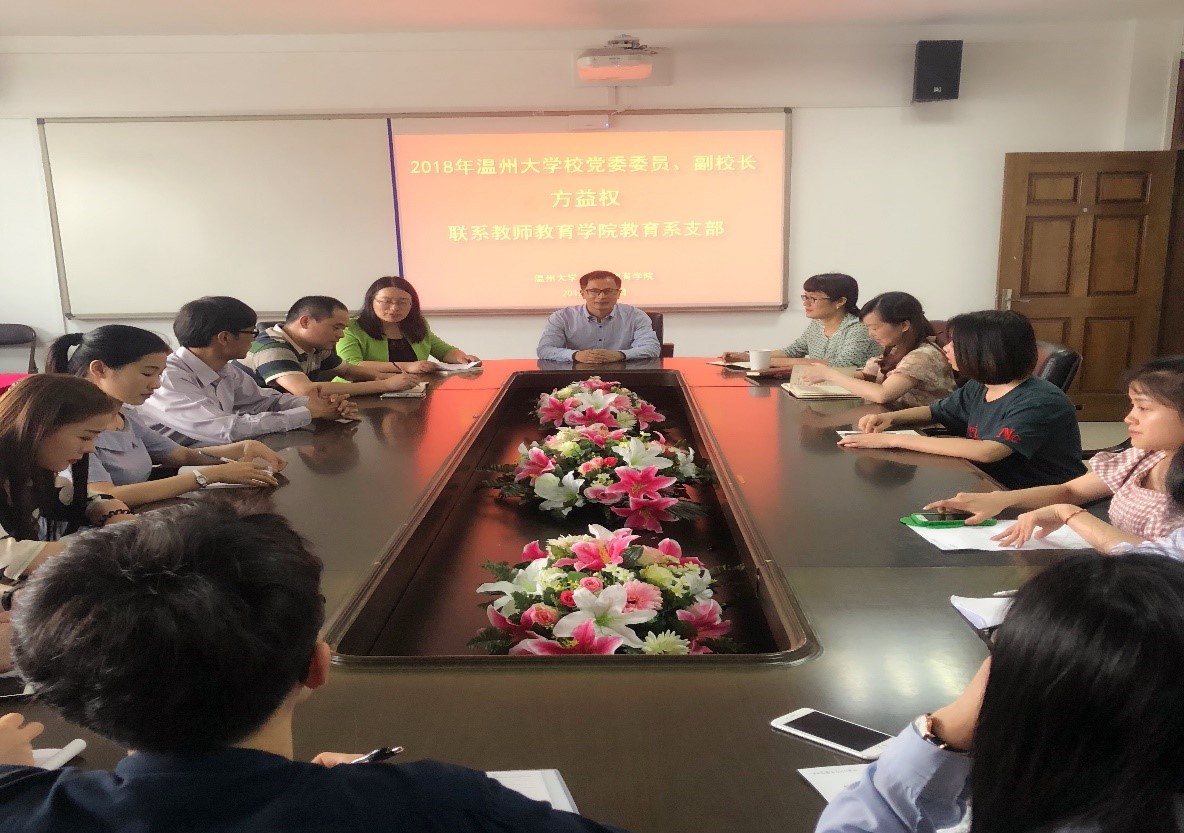 根据学校党支部建设年工作安排,学校党委委员、副校长方益权教授联系结对我院教育系党支部,指导支部建设工作。教育系党支部书记周奇老师简要介绍了支部的基本情况,言简意赅向结对领导方益权校长汇报了教育系支部和研究生支部上一学期以来的各项理论学习活动、实践活动,以及在支部建设方面取得的成绩。