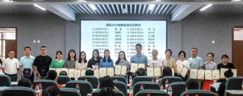 彭小媚副书记宣读2020年度学院本专科、研究生班主任聘任文件,张敏部长与何毅书记为20级新生班主任颁发聘书。