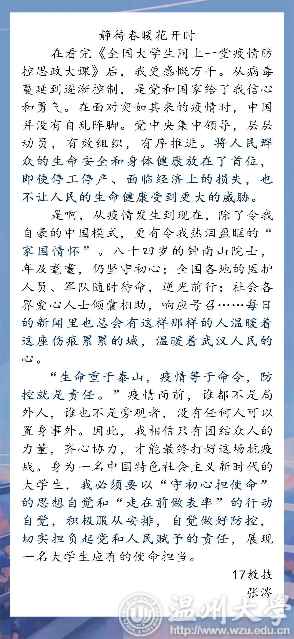 通过收看此次疫情防控思政大课,我院学子有体悟,有思考,有收获。从疫情大考到责任与使命,从个人的担当到为国奉献,同学们畅所欲言,交流学习心得,分享自己的感悟和体会。