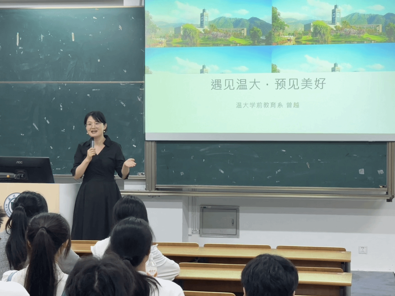 首先,学前教育系主任曾越老师介绍了威廉概况、专业发展以及专业特色,重点讲述了学前系理论实践相结合、实训基地和儿童剧等特色。