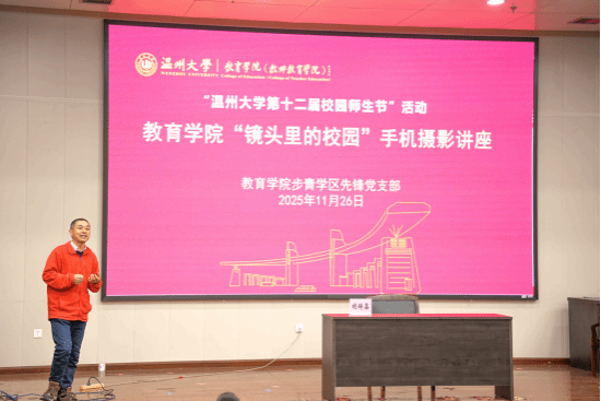 讲座伊始,胡大师结合自身20余年摄影经验,分享了“兴趣是坚持与成功的原动力”“直路有捷径,弯路有风景”的人生感悟,鼓励同学们以摄影为媒,记录生活、留存记忆。随后,他围绕校园摄影核心内容展开讲解:从电子屏背景拍摄需将快门速度调至1/100秒的实用技巧,到“光线、构图、情感”三位一体的决定性瞬间捕捉原则;从校园四季风光、建筑倒影等拍摄场景推荐,到人像摄影“抓眼神、避低头闭眼”的关键要点,通过大量实拍案例让同学们直观感受摄影魅力。
