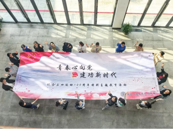 随后,学子们高唱团歌,将属于青年的歌声送给这个特殊的日子。钢琴与小提琴的旋律和着同学们的歌声,吸引着众多路过的同学。他们以整齐的阵型,从“五四”变换到“100”,再从“100”变换到中国共青团团徽,动作干净利落,整齐划一。“光荣啊,中国共青团”,歌声在学院的上空久久回荡!