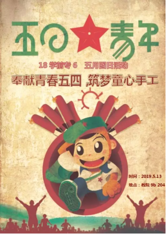 “孩子,是祖国的未来。青年,是民族的希望。”18学前专6的同学们一直坚信着这句话。因此在五四青年节到来之际,班级组织了手工制作活动,并将成品赠送给福利院的小朋友们,以此发扬奉献精神,争做时代“五四青年”。在最后,全班献唱了《光荣啊!共青团!》,彰显作为一名共青团员的骄傲与自豪。