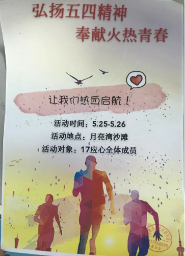 5月25日,17应心的同学们来到月亮湾海滩开展了他们的主题团日活动。同学们在领略祖国好风光的同时,还讲述了他们自己的五四故事,讨论了何为五四精神,以及如何传承五四精神。随后他们一起观看纪念五四运动的视频,从中深刻体会到了浓浓的爱国情怀。