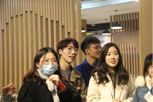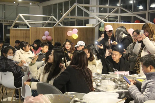 在吃完热腾腾的饺子之后,就进入了游戏环节。首先是抱团游戏,当主持人喊一个数字,大家就立即与临近的同伴按所喊数字抱成一团,没有抱团成功的同学被淘汰出局、接受惩罚。紧张的气氛牵动着在场同学们的心,寻找队友的同时,也建立了彼此之间的联系,拉近了彼此的距离,加深了游戏成员们对于团队的归属感。
