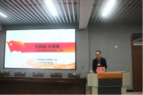 丁强讲解“挑战杯”系列赛事及政策。他从学生层面、教师层面以及学院层面展开叙述了比赛的评价激励机制。他指出,筹备“挑战杯”赛事应该学习、实践两论并举,专业工作坊、创客空间两翼齐飞,学生教师两层推进。备战“挑战杯”的过程并不容易,项目的遴选要经历两筛两审,还要经过层层选拔,尽管备战艰辛,但这个过程一定是值得的。
