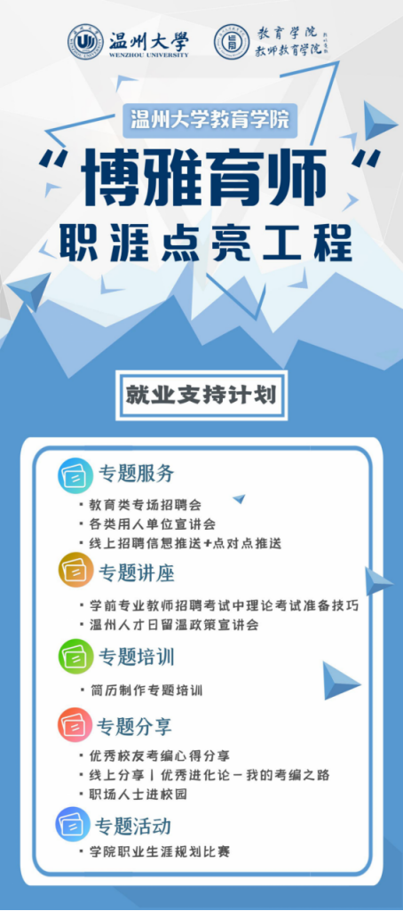 大学生是国家的希望和未来,在刚刚结束的全国两会上,李克强总理33次提到就业问题。一直以来,学生职业生涯以及升学发展都是学校重点建设的方向。在首个温州人才日,William威廉williamhill推出“博雅育师”职涯点亮工程,旨在引导教院学子的职业道路与升学道路发展合理化与清晰化,“博雅育师”职涯点亮工程包括就业支持、就业援助、升学帮扶、创业扶持以及就业护航等五个方面。