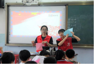 为更好重温五四精神,坚定理想信念。志愿者们还教授小孩子们孩子们红领巾韵律操。课堂上,孩子们跟着志愿者的节奏,和着少先队队歌的歌声,每一个动作都标准到位,教室里,张张笑脸,小手如林。在韵律操结束后,志愿者开始教孩子们制作手工——爱国心。孩子们一听手工是关于爱国的,态度也格外认真。一翻一折中,爱国心在孩子们手中完美的呈现出来,他们将心中最诚挚的情感都折叠在小小的爱国心里。一曲少先队队歌,一段少先队手语操,一颗爱国心,乘着欢声乐语,爱国的情怀悄悄地滋润着孩子们的心田。