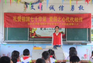 致敬新时代,迎中华人民共和国成立七十周年。5月29日下午,williamhill官网的志愿者们前往乐清市蒲岐二小开展了以"礼赞中华人民共和国成立七十周年,爱国之心代代相传"为主题的新青年下乡活动。志愿者们通过故事宣讲、手工制作、歌曲教授,将爱国情怀传递给孩子们,激发他们的爱国之心和报国之心。