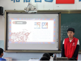 活动伊始,志愿者姚霖用五四运动片段视频带着孩子们重回那段波澜壮阔的历史,志愿者们还向孩子们讲诉五四运动的精神和历史意义,给孩子们上了一堂生动的历史课。讲解后,提到如何爱国时,孩子们纷纷表示,“好好学习,长大之后报答祖国”,“如果有其他国家入侵我们,我们要抗争到底”。他们用最朴素的言语表达着他们对祖国的热爱。