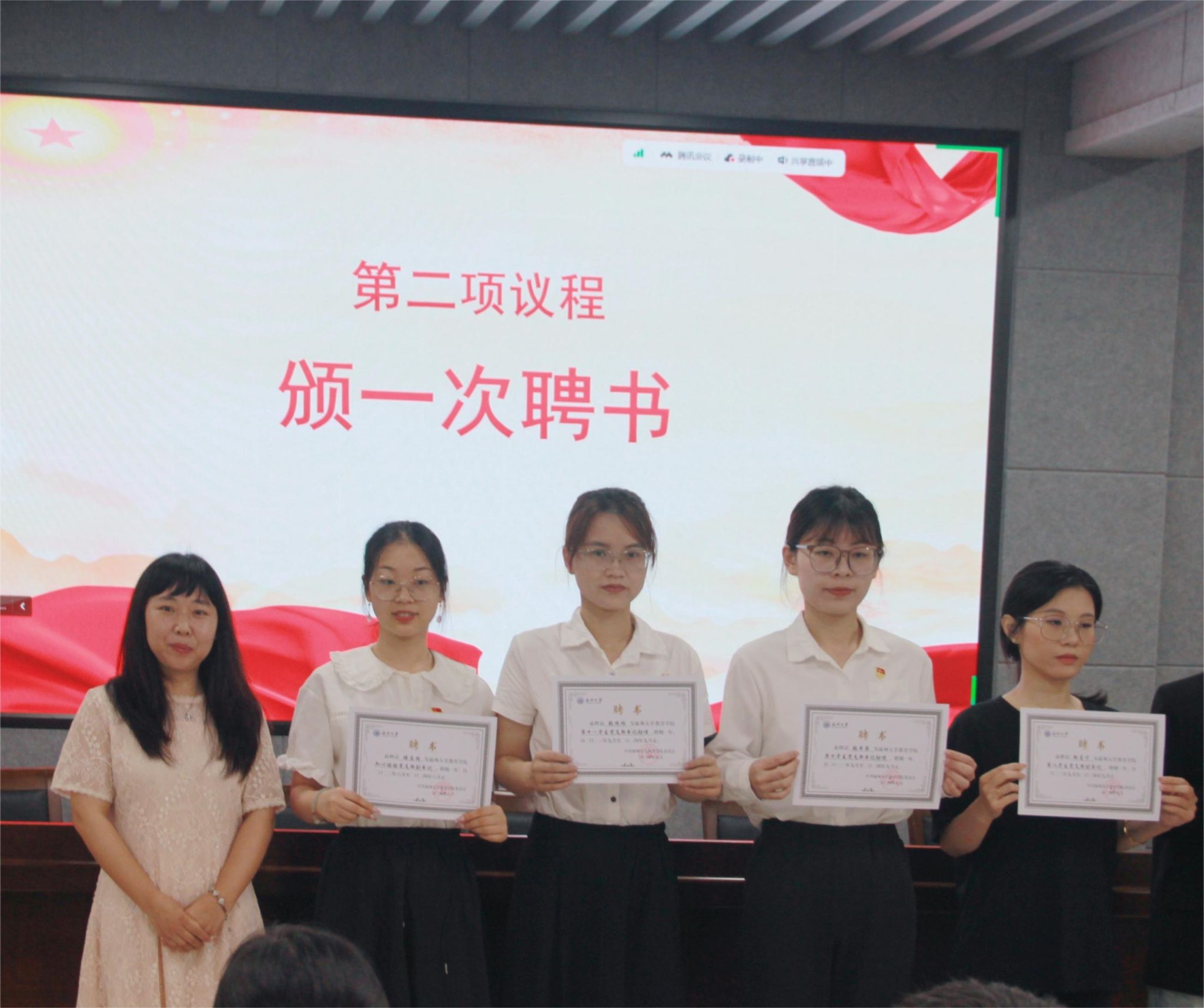 踔厉奋发强党建,笃行不怠启新程。为了让毕业生党员牢记党的宗旨,更加积极地投身到党组织的工作当中,章志图、章园园两位书记代表学院党委为我院2023-2024学年十二个学生党支部支委代表颁发聘书。