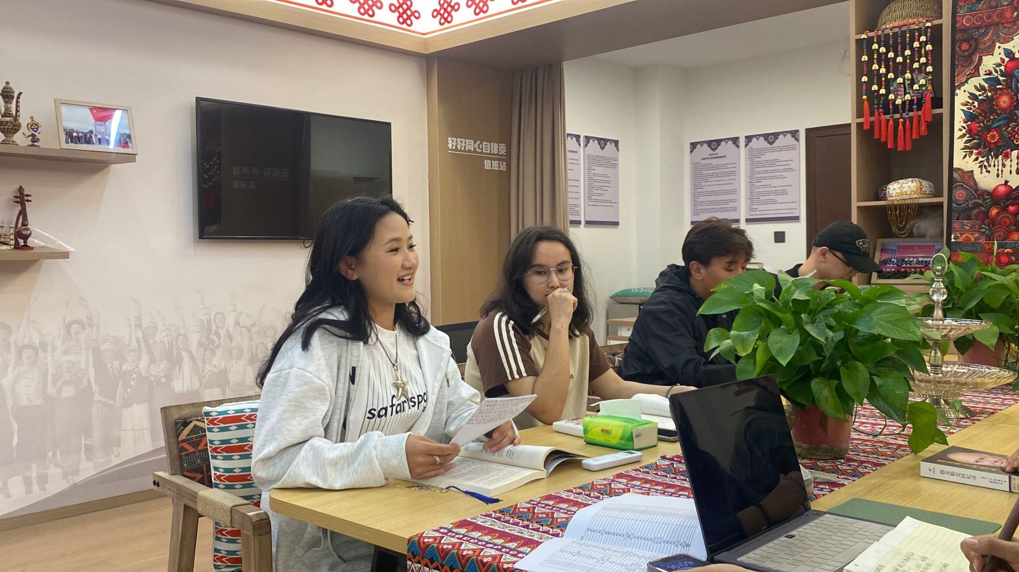 民族工作室负责人章园园老师以“隐形阶梯”妙喻读书之道:“在汉字里读懂长江黄河的奔涌,在藏文经典中触摸雪域高原的脉搏,每本书都是打开新世界的任意门。”她更以工作室命名寄寓深意:“石榴花开的红,是56个民族共同浇灌的精神底色。”