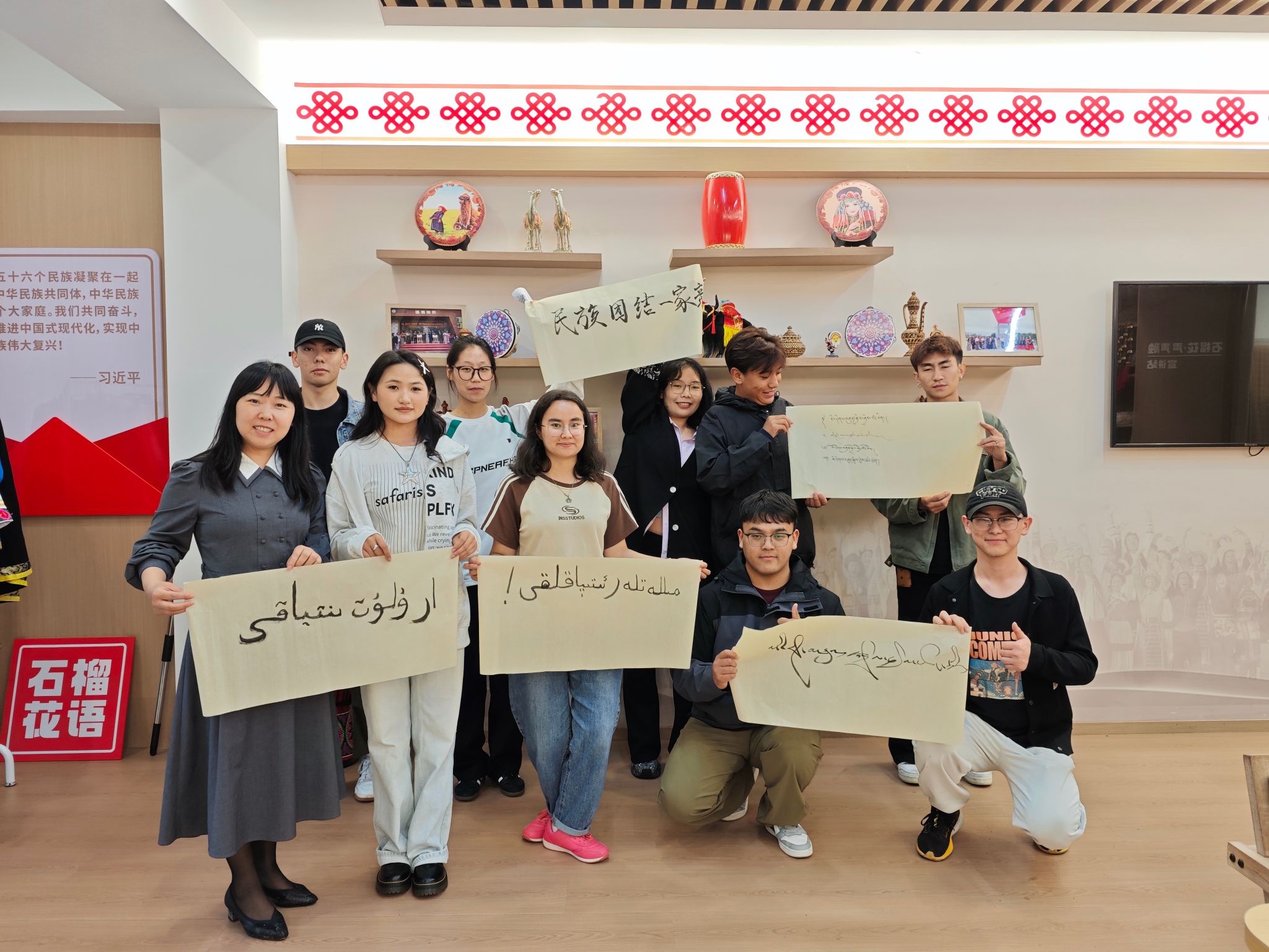 活动尾声,唐努尔与罗德同学执笔共书“民族团结一家亲”。藏文的浑厚庄重、维吾尔文的飘逸灵动与汉字的方正典雅在宣纸上交相辉映,三种文字如石榴籽般紧密排列,当不同语言的声浪汇聚成同一旋律时,“石榴花开”的故事就在书香中绵延生长。