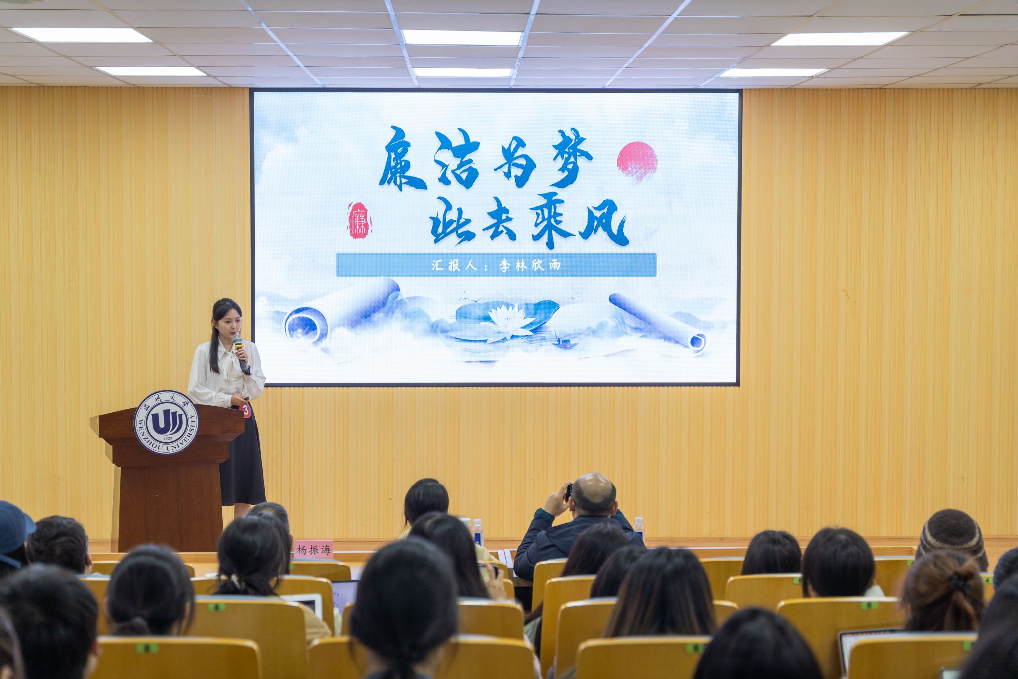 我院23小教2班的李林欣雨同学代表学院参赛,她以《廉洁为梦,此去乘风》为主题,以苏步青先生“不忘初心,慎独修己”、陶行知先生“捧着一颗心来,不带半根草去”的高尚情操为例,动情阐述廉洁乃修身之道、民族之气、时代之责,鼓励大学生树立廉洁意识,培养清廉品质。