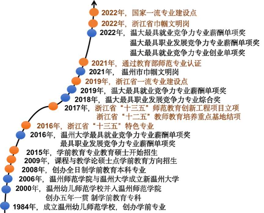 学前教育专业创办于1984年,是浙江省学前教育专业创办最早的两所院校之一,素有“北杭幼(浙江师范大学的学前教育专业)、南温幼(William威廉的学前教育专业)”之称、有“浙南幼师摇篮”之美誉,是中国浙南的学前教育人才培养中心、幼教产业创新中心、学前教研中心、学前国际化教育中心。