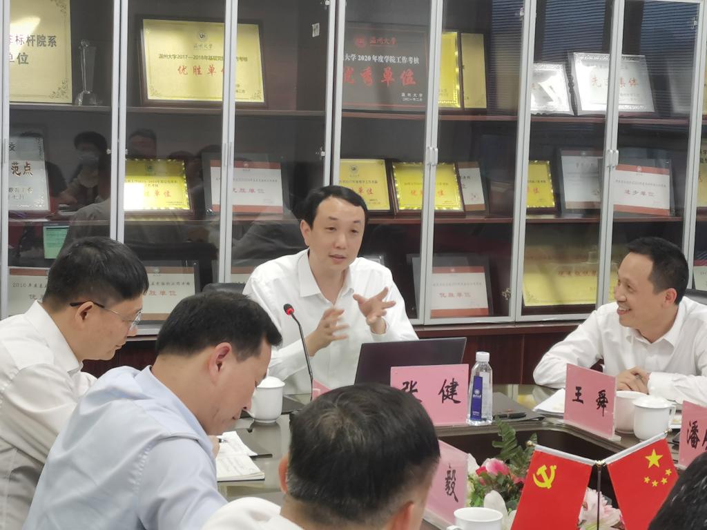 张健书记一边听取工作汇报一边就相关问题进行提问交流,在深入了解学院发展现状后,对学院近年来取得的显著成绩予以充分肯定。张书记指出,学院注重师范底蕴传承,发展势头良好,下一阶段要进一步凝练学科特色,瞄准重点领域,找到小切口,加强顶层设计;要进一步彰显师范教育特色,加强品牌打造,强化与中小学联动,提高毕业生竞争力,实现高质量就业;要进一步加大人才引育,与国内外名校加强对接交流,实行精准引才;要进一步加强专业内涵建设,抢抓机遇,直面挑战,全面建成国家一流专业;要进一步提升服务社会能力,对接产业需求,为地方经济社会发展贡献力量。