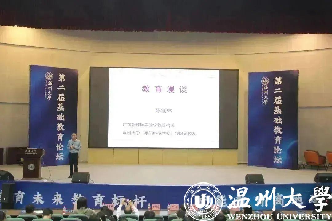 广东碧桂园教育集团区域总校长、温州市首批教育名家、浙江省第八届督学、长三角第七届最具影响力校长、温大williamhill84届校友陈钱林作《教育漫谈》主旨报告。报告从学习、立德树人、家庭教育、国际课堂以及专业成长五个方面展开。陈校长从学习的基础谈起,向与会人员分享了学习方法,并针对不同的学科提出了自己的理解;通过原创“健全人格”坐标图,陈校长提出了关于立德树人的思考。“家庭教育的本质是育人,重自律、自学、自立。”针对目前较热的家庭教育问题,陈校长强调“最好的家庭教育是亲子健身、亲子阅读、亲子探究、亲子对话、亲子共成长”;在中、西方教育的比较下,“有志向、善学习、抓机遇”对于个人成长大有裨益。与会人员互动频繁,现场气氛热烈。