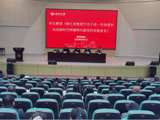 会议进行师德师风专题教育。何毅书记传达解读《浙江省教育厅关于进一步加强和改进新时代师德师风建设的实施意见》文件精神。何书记从教师队伍思想政治建设、教师职业道德素养、师德失范行为惩处、师德管理长效机制、营造尊师重教氛围、压实师德师风建设责任等六个方面对进一步加强和改进新时代师德师风建设提出的十四条具体要求做了深度解读。