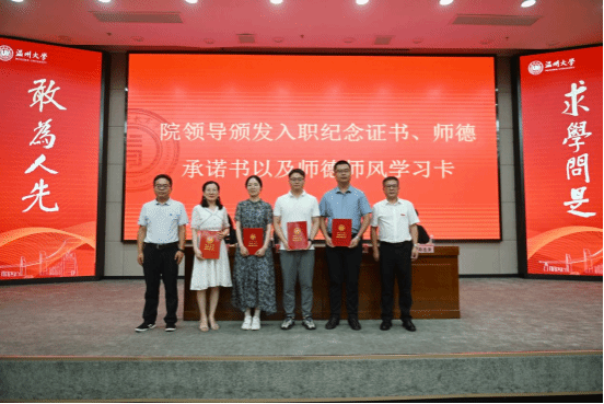 学院举行新教师入职仪式。李长吉院长、张敏书记为王鹏等四位新入职教师颁发入职纪念证书、教师师德承诺书、师德师风建设制度摘要等,并合影留念。各系(中心)负责人为新教师佩戴校徽,送上鲜花,表达对新入职老师的热烈欢迎和殷切期望。