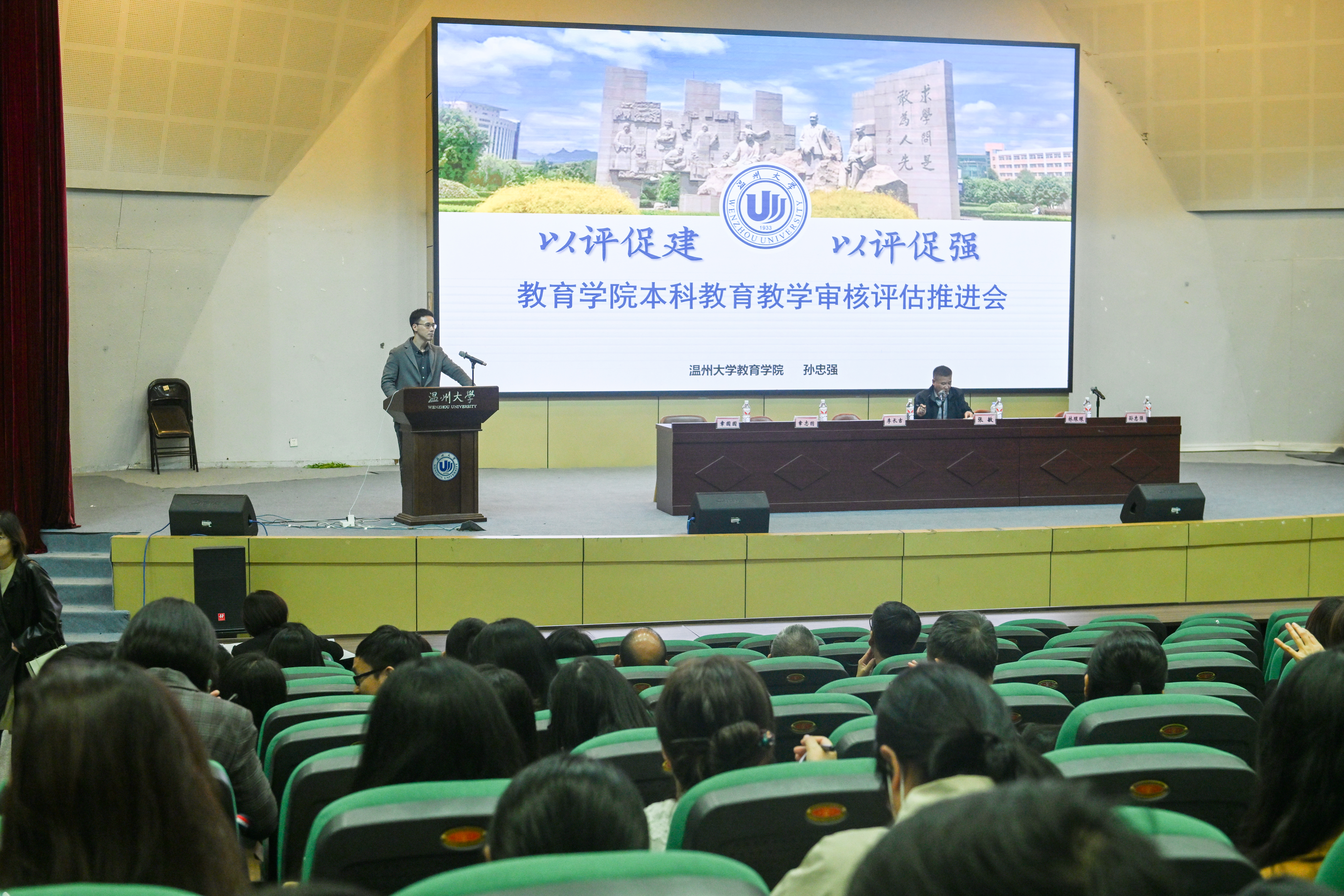 学院审核评估工作小组副组长孙忠强副院长作《以评促建,以评促强》的本科教育教学审核评估评建工作推进报告。他从本科审核评估常识、工作计划与时间节点、当前挑战与紧迫任务三方面对学院自评自建工作的总体安排和当前进展情况进行了详细梳理,并进一步部署了审核评估自查自建与自评整改重点工作方向。他指出,全体教职工要深化认识,提高站位,压实责任,以学校新一轮审核评估为契机,明确我院发展定位与存在的问题,全面展示教院本科教育教学取得的成绩,确保各项评估任务按时高效完成。