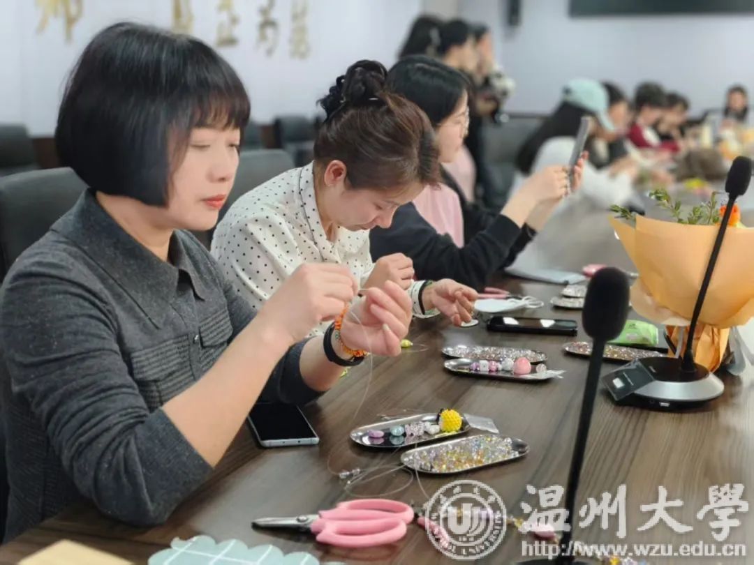 “老师们看这里,先拿出我们工具包里的鱼线......”身着围裙的手工老师拿起鱼线和珠子,开始了细致的教学。老师们指间轻巧流转,将线头穿入细小的孔中。当线从另一端悄然钻出时,她们的脸上绽放出纯净的笑容,仿佛瞥见了心中那片梦寐以求的星河。她们专注于有趣的创造,沉浸于这份手工的乐趣之中。