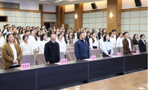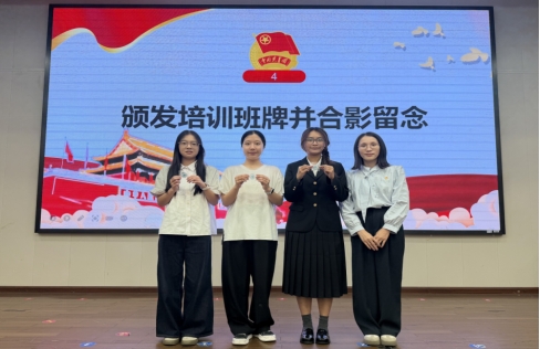 在接下来的环节中,与会老师为参训学员代表颁发了培训班班牌,并合影留念。一枚枚班牌象征着责任与使命,也寄托着对学员们学有所成的美好祝愿。紧接着,在学生代表郑潇涵的带领下,全体学员进行了庄严宣誓。铿锵的誓言坚定了学员们履职尽责、服务同学的决心,标志着从“我承诺”到“我必行”的信念升华。