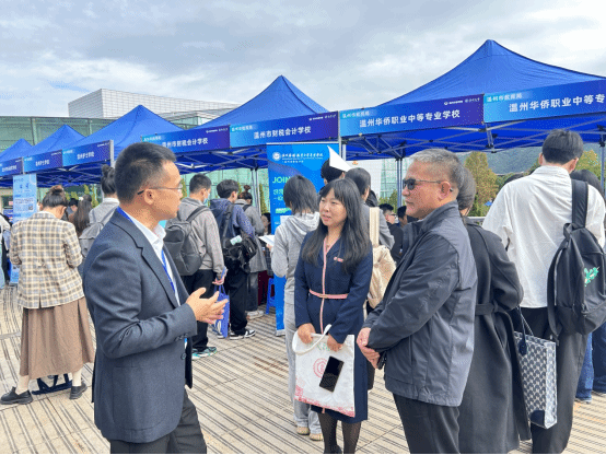 在招聘会现场,学院领导与鹿城区教育局、瓯海区教育局、温州艺文高中等用人单位负责人交流,介绍学院小学教育、学前教育、应用心理学、教育技术学等专业毕业生情况,了解岗位需求。用人单位对学院人才培养质量给予高度评价,期待加强合作。