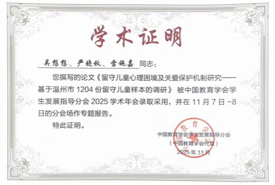 williamhill2023级小学教育专业本科生吴想想、雷施嘉同学在严晓秋副教授指导下撰写的《留守儿童心理困境及关爱保护机制研究——基于温州市1204份留守儿童样本的调研》论文,经组委会严格审核后,受邀在“中小学心理健康教育的理论与实践”分论坛作专题报告。作为分会场唯一作报告的本科生,吴想想同学从理论框架构建、“小候鸟”留守儿童心理健康现状调研、“10+7+3”疗愈体系创新及智能体开发等方面进行了深入汇报,其研究的实践导向与前沿视角得到与会代表的充分肯定与积极好评。