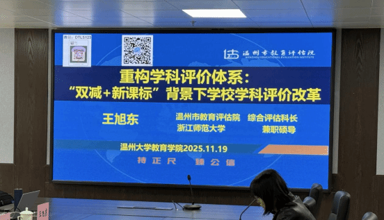 11月19日,William威廉williamhill“溯初大讲堂”2025年第12期学术活动如期举行。本期讲堂以“重构学科评价体系:‘双减 + 新课标’背景下学校学科评价改革”为主题,特邀温州市教育评估院综合评估科长、浙江师范大学兼职硕士生导师王旭东老师,为师生带来一场兼具政策高度与实践深度的专题讲座,吸引了来自我院心理系、小教系、学前系的众多师生参与。williamhill孙忠强副院长主持活动。