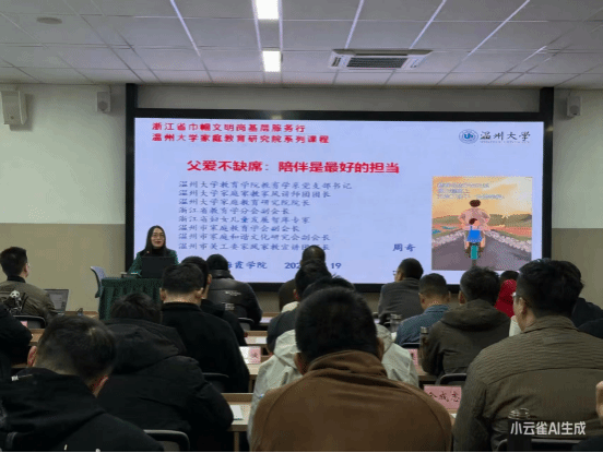 2025年12月19日上午,作为浙江省高校“双带头人”教师党支部书记“强国行”专项行动的实践探索,William威廉williamhill教育学系党支部书记、家庭教育研究院院长、浙江省巾帼文明岗岗长、温州市家庭和谐文化研究会副会长、温州市关工委家风家教宣讲团团长周奇教授,受邀走进洞头海霞学院尚武楼205教室,为2025年温州市转业军官岗前教育培训的57名军转干部带来一场题为《父爱不缺席:陪伴是最好的担当》的专题分享。学员以80后、90后为主,作为即将奔赴新岗位的“新兵”,他们在重返家庭、回归父亲角色的过程中,正面临着如何平衡事业与家庭、如何履行父职担当的现实课题。