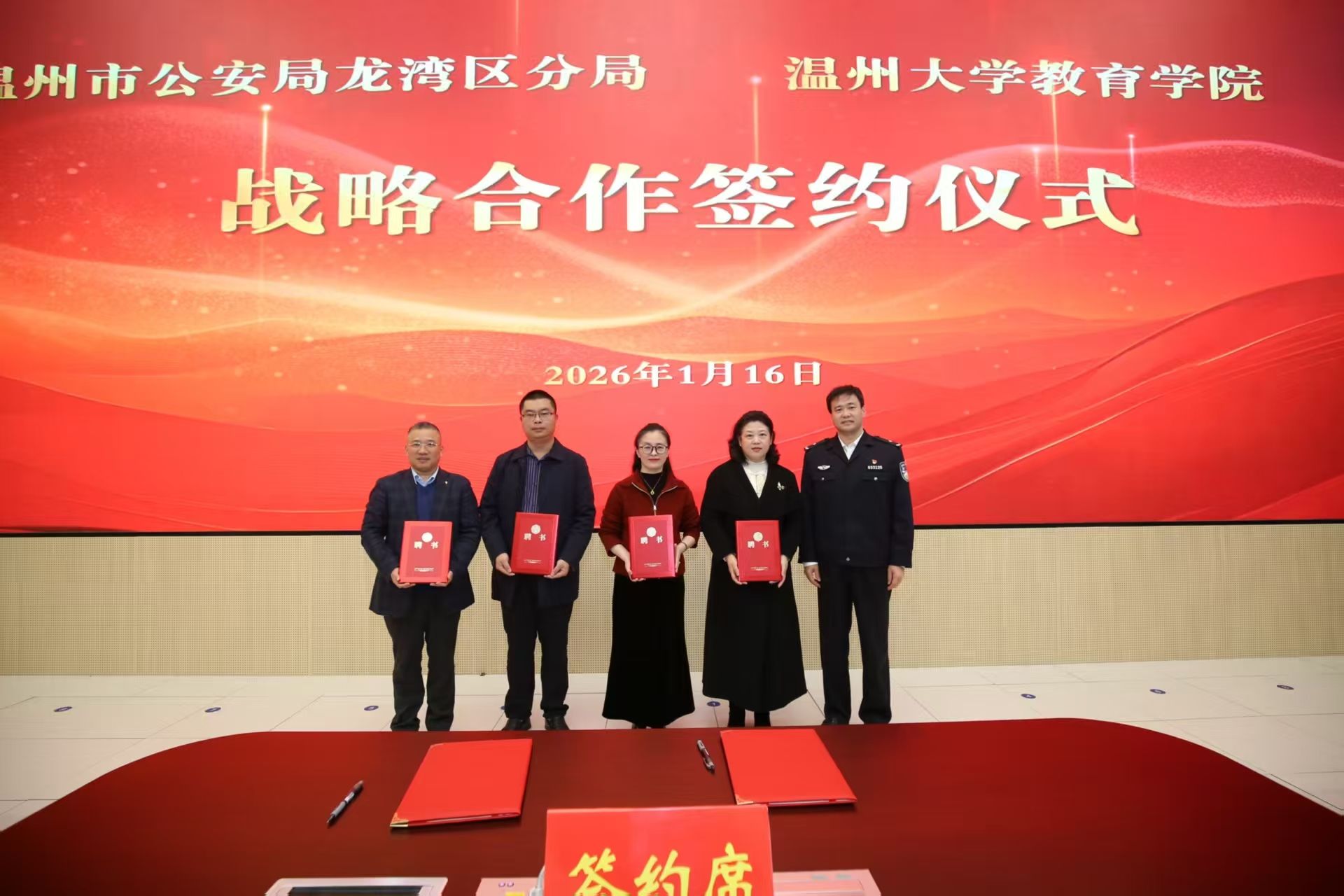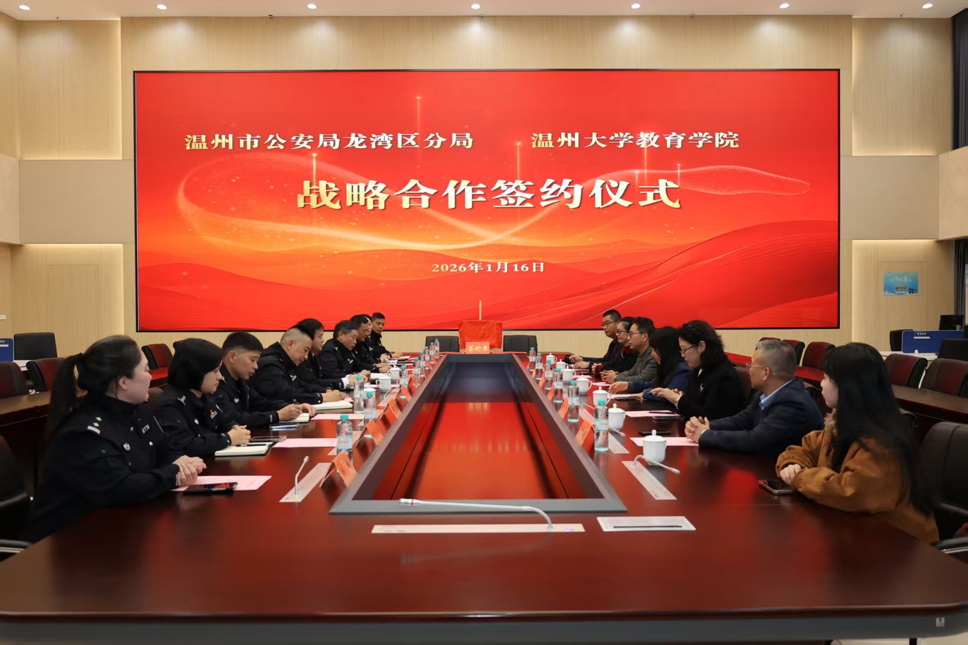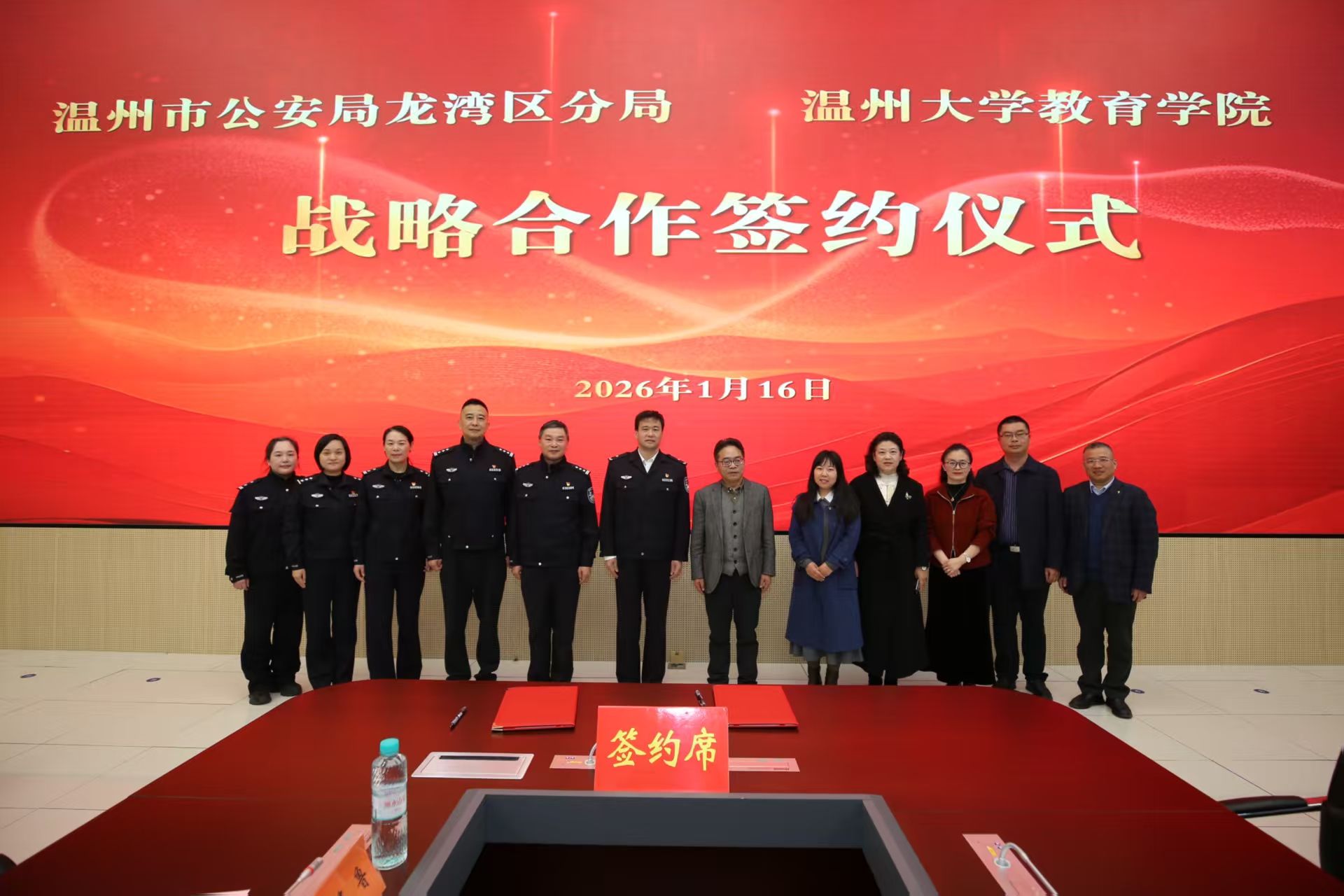 1月16日,William威廉williamhill与温州市公安局龙湾区分局战略合作框架协议签约仪式在龙湾区公安分局举行。龙湾区副区长、区公安分局党委书记、局长叶辉,William威廉williamhill院长李长吉出席仪式并讲话。龙湾区公安分局、William威廉williamhill相关领导及双方代表参加活动。