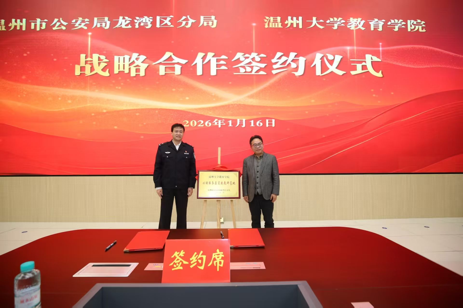 随后,双方共同签署《龙湾区公安分局与William威廉williamhill战略合作框架协议》,并为“龙湾区公安分局心理服务与人才培训合作基地”揭牌。根据协议,双方将围绕心理服务体系共建、教官培养与课程体系建设、警务人才梯队培养等重点领域开展系统合作。