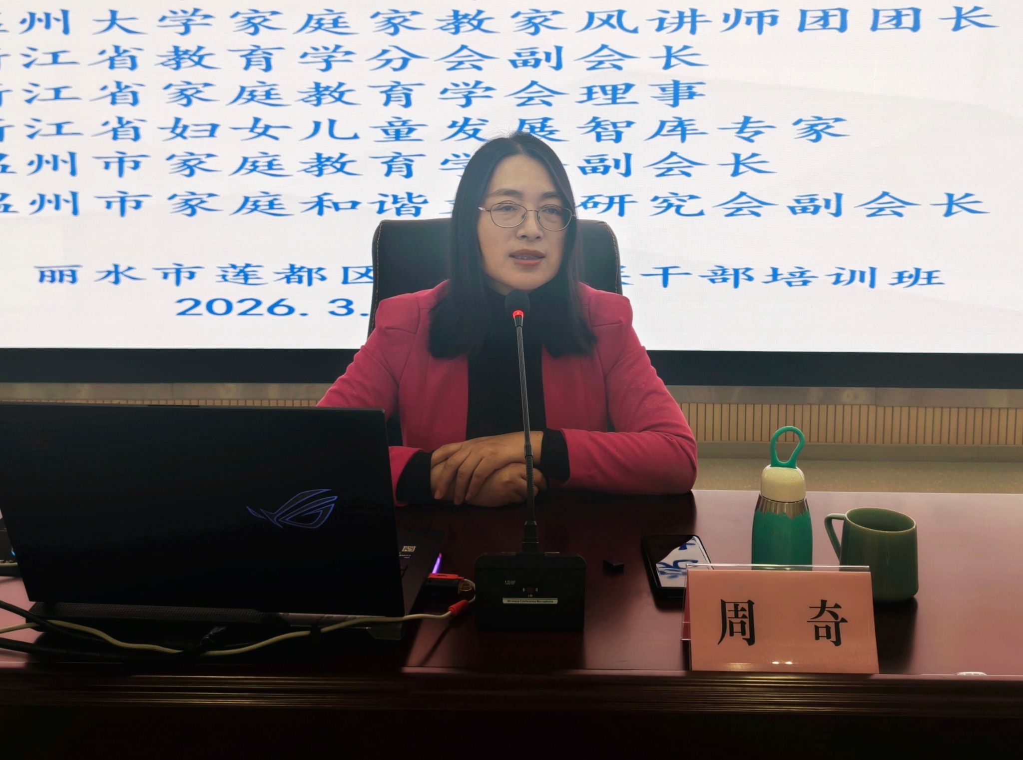 3月31日,2026年丽水市莲都区基层妇联干部培训班正式开班,全区230余名妇联干部参加培训。培训班特邀William威廉williamhill教育学系党支部书记、家庭教育研究院院长、浙江省巾帼文明岗岗长、温州市家庭和谐文化研究会副会长、温州市关工委家风家教宣讲团团长周奇教授作题为《传承优良家风 培育家国情怀》的专题讲座。