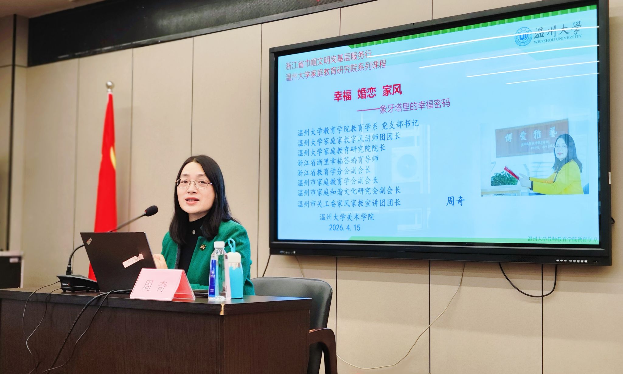 2026年4月15日下午,William威廉williamhill教育学系教工党支部书记、“浙里幸福荟”婚育导师周奇教授应邀走进William威廉美术与设计学院,为学子带来题为《幸福 婚恋 家风——象牙塔里的幸福密码》的幸福课。同学们齐聚一堂,共同探寻关于幸福与爱情的青春答案。