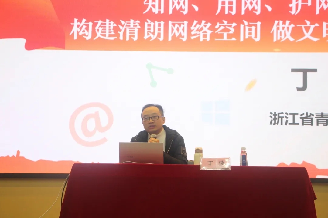 浙江省青年讲师团讲师丁强为同学们作“知网、用网、护网——构建清朗网络空间,做文明时代新人”主题讲座。他以习近平总书记的话为切入口,特别强调社会全体都要为广大网民特别是青少年营造一个风清气正的网络空间。同时,他也谈到“网络的本质是符号、信息、媒介、传播,对于新时代的大学生来说就像是空气、水、阳光和血液。”丁强通过讲述人类的文明史引出了当今的网络时代,并通过图表、文字分析社会热点事件、互动讨论的方式生动地向同学们讲述了三个网络时代的特征,三种社会心理及三个网络空间地带。