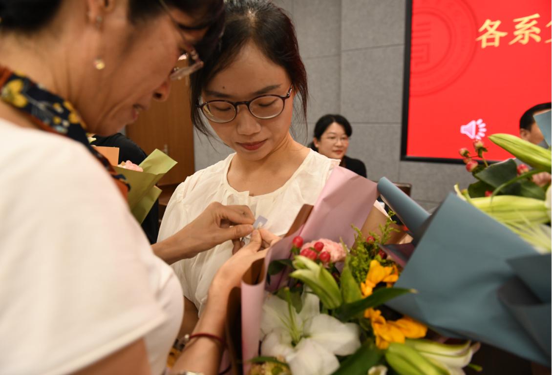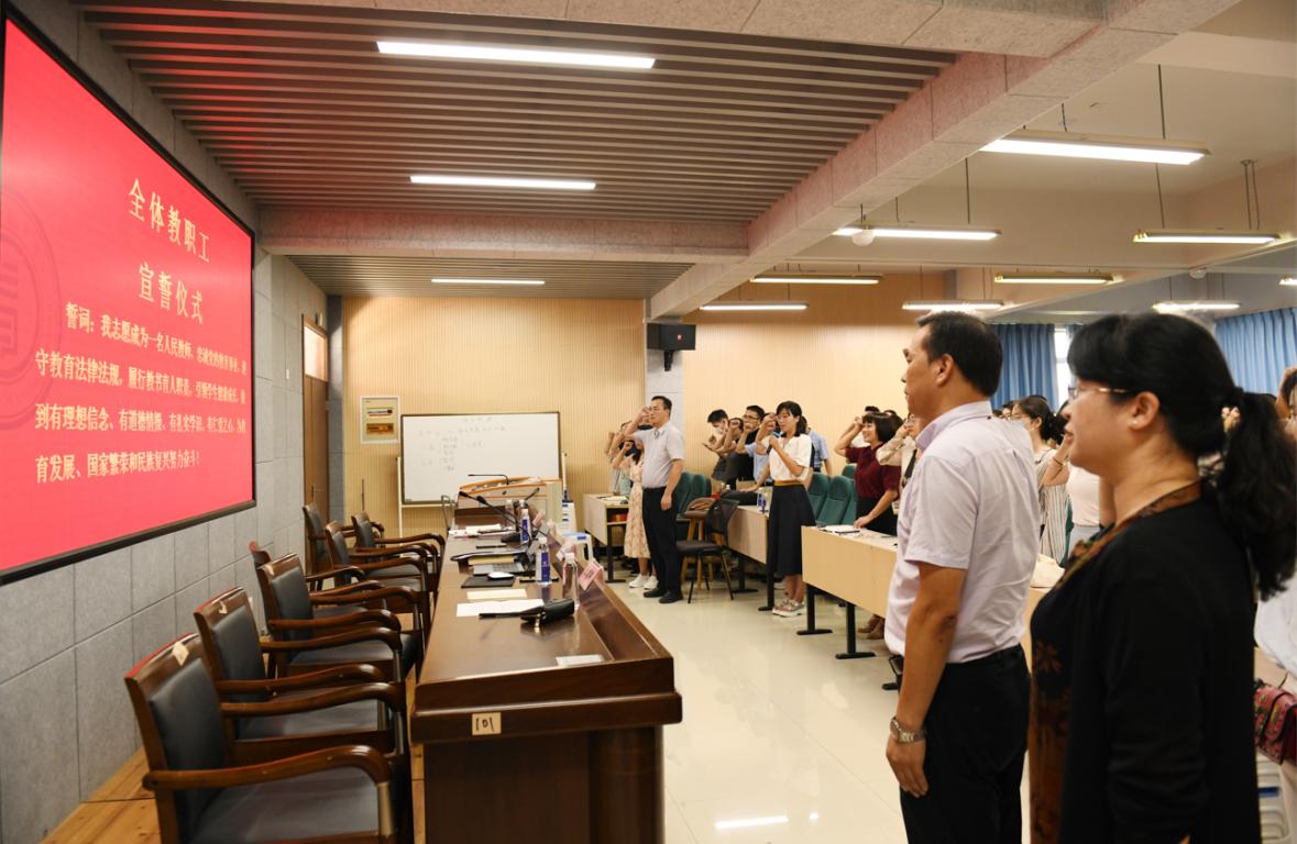 首先进行隆重而热烈的新教师入职仪式。何书记为新入职的6位教师颁发入职纪念证书、师德承诺书以及师德师风建设制度摘要等材料,新教师们怀着激动的心情走上主席台,何书记为新教师一一颁发williamhill入职“三件套”并合影留念。各系负责人为新教师佩戴校徽,并送上鲜花,表达对新入职老师的热烈欢迎和殷切期望。入职仪式后,全体教师起立,举起右手,进行教师宣誓仪式。作为教育工作者,每年在教师节前夕举行全体教师宣誓是学院师德建设的传统,提醒全体教师时刻不忘立德树人初心,牢记为党育人、为国育才的使命。