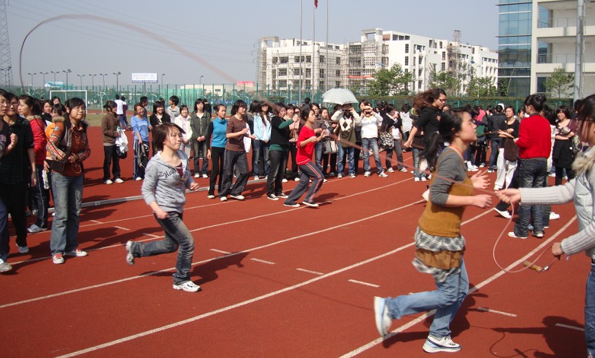 在两人三足环节中,两位同学手牵手肩并肩,虽然两脚被绑到一起,但同学之间仍旧配合默契,速度飞快。当然,偶尔也会出现脚步混乱的场面。比赛激烈,场外观看的同学热情更是高涨,加油声、呐喊声,震耳欲聋。而呼拉圈环节,难度也不小。要在保持转动的同时,快步前进,这绝非易事。赛场上,在女生间不难发现还有男选手。当被问有无信心时,男生说:“别以为这些只有女生行,其实男生也不弱。待会就让你们瞧瞧!”果然,话不是吹的。只见几个男生健步飞奔,实力不容小觑。