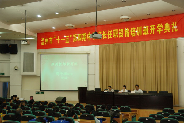 11月10日下午,温州市“十一五”第四期中学校长任职资格培训班开学典礼在学院路校区信息楼报告厅隆重举行。林娟娟副校长,温州市教师教育院周平珊院长,我院党总支书记胡伟国等出席开学典礼。培训班班主任和103位来自温州地区各市县的参训校长参加典礼,胡伟国书记担任主持。