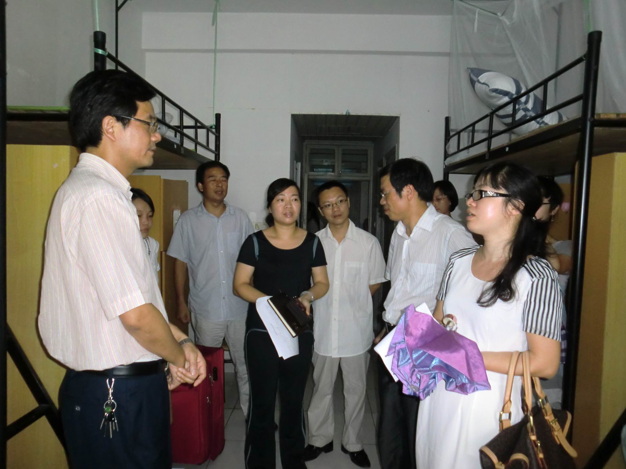 晚上,院领导胡来林、潘玉进、张宝臣、郑信军、孙芙蓉、嵇小怡等领导在辅导员陪同下走访每个新生寝室,与新生近距离沟通。在走访的过程中,针对新生们十分关注的专业学习问题和就业问题,胡院长结合各专业就业情况和当前就业形势分析了我院各专业良好的就业前景,使新生们坚定了自己的信念,明确了专业学习方向,承诺以优异的成绩迎接就业挑战。潘玉进、张宝臣等副院长在走访过程中向新生们介绍了学校与学院的具体情况,使新生们能够尽快了解大学生活,并鼓励新生充分利用学校资源,提高综合素质。嵇书记在走访中特别关心家庭经济困难的新生,向新生介绍了我校和我院的助学解困的政策,激励新生安心学习,自立自强。同时,嵇书记也特别叮嘱新生要注意安全,防患于未然。
