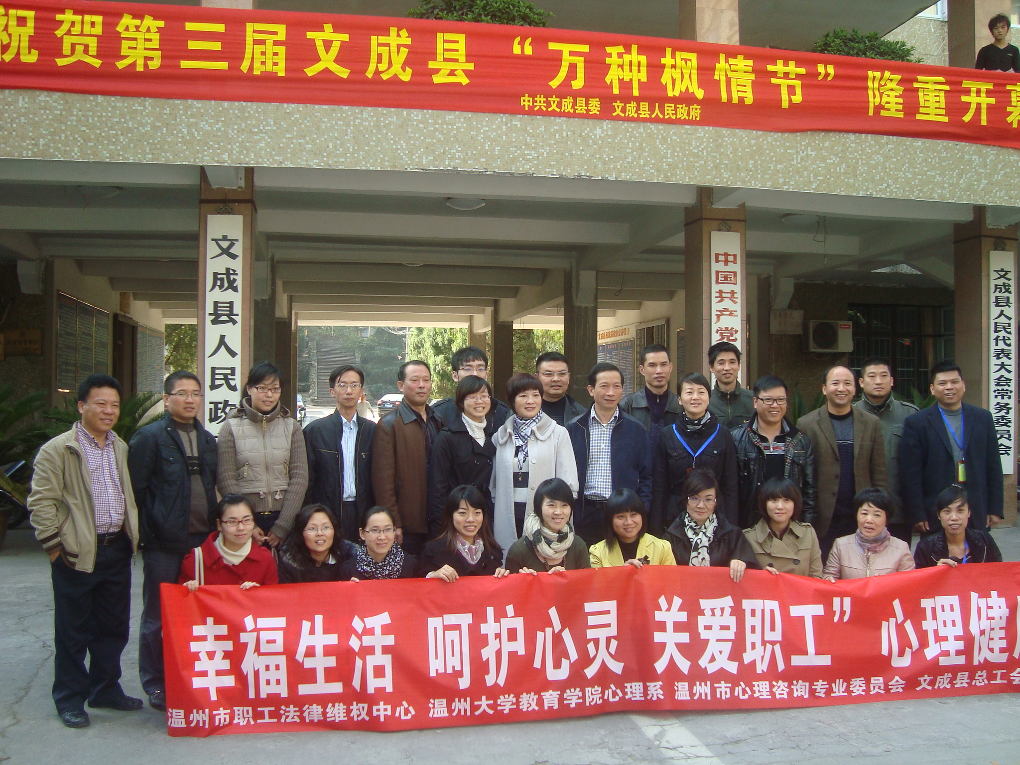 11月27日,我院心理学系与温州市职工法律维权中心、温州市心理咨询专业委员会,在文成县联合开展心理健康系列活动。市总工会、文成县总工会有关领导,市心理咨询专业委员会负责人及我院心理系盛建森老师参加了活动。