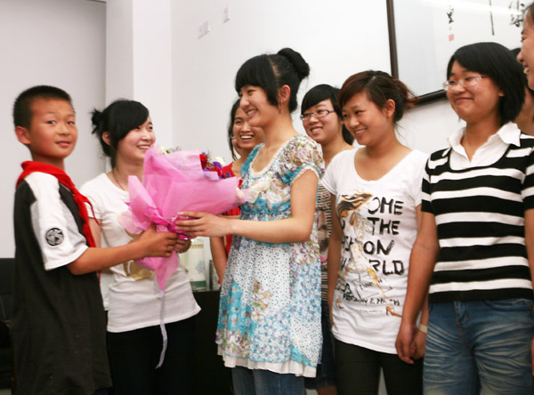 当天晚上的座谈会上,爱心家教服务对象雷宁小同学也应邀请前来参加,他为自己的家教老师周晓微同学献上一束美丽的鲜花,他说:最美的鲜花要献给最美的老师(如图)。williamhill官网党委副书记嵇小怡老师在座谈会上指出,爱心家教活动对大学生的成长成才具有积极作用,我院将坚持把爱心家教工作做下去争取更好的成绩。(章志图/文 翁卿仑/摄)
