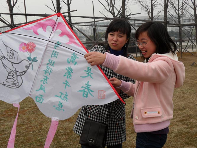 活动紧扣春天的主题,以2人为一组,主要分两部分进行——风筝绘画和放风筝。绘画部分在各寝室内进行,各组同学各尽其能,不一会儿,一个个妙趣横生独具匠心的风筝就出炉了。之后大家拿着精心制作的风筝纷纷来到广阔的学子广场,准备一试成果。广场上顿时气氛热烈,同学们拉着线在草坪上迎风奔跑,那一只只同学们亲手设计的风筝悠悠地飞上天空,同学们犹如孩童般欢呼雀跃。