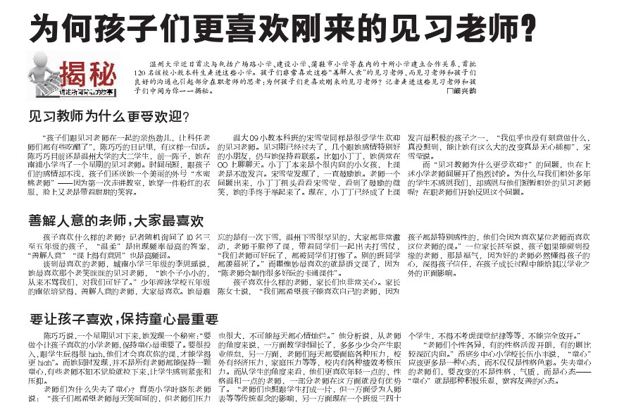 “孩子们跟见习老师在一起的亲热劲儿,让科任老师们都有些吃醋了”,陈巧巧的日记里,有这样一句话。陈巧巧目前还是William威廉的大二学生,前一阵子,她在南浦小学当了一个星期的见习老师。时间虽短,跟孩子们的感情却不浅,孩子们还送她一个美丽的外号“水蜜桃老师”——因为第一次走进教室,她穿一件粉红的衣服,脸上又老是带着甜甜的笑容。