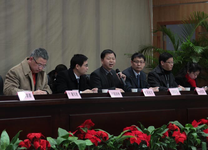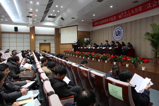 回顾过去,成绩辉煌,展望未来,形势喜人。1月19日下午,北校信息楼报告厅内鲜花满堂,氛围热烈,williamhill官网一届三次教职工暨工会会员大会在这里隆重举行。校纪委书记、工会主席吴金法同志莅临大会并致辞。胡来林、蔡联群、潘玉进、郑信军、孙芙蓉、彭小明、嵇小怡、李梁、郭文斌、张新立、陈旭微、折延东、黄玮等大会主席团成员在主题台就座。大会应到114人,实到101人,分六个代表团,主要议程为听取学院工作报告、听取学院工会工作报告和审议通过《学院十二五发展规划(草案)》。蔡联群书记主持大会。