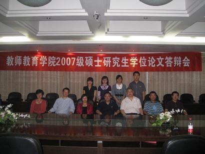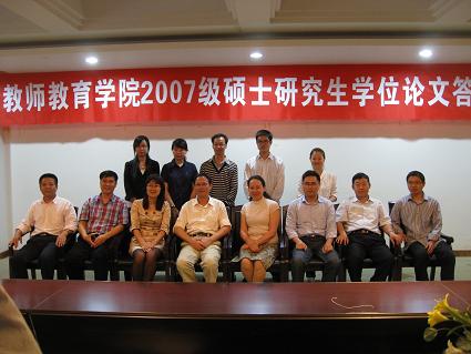 心理组由曹立人教授主持;教育、计算机组由盛群力教授主持,他们首先介绍了答辩委员会成员和答辩的学生,其次,说明了答辩的程序,然后研究生按之前的抽签顺序依次进行研究阐述,阐述完毕,第一个同学开始回答问题。整个答辩过程,气氛融洽,张弛有度,持续了一下午。最后心理组曹立人教授郑重地宣布我院07级研究生任强同学、孙洲同学、田晓霞同学、符自萍同学顺利通过答辩;教育、计算机组盛群力教授郑重地宣布我院07级研究生王亚卓同学、李璐同学、齐晶莹同学、李家德同学、祝成林同学顺利通过答辩。